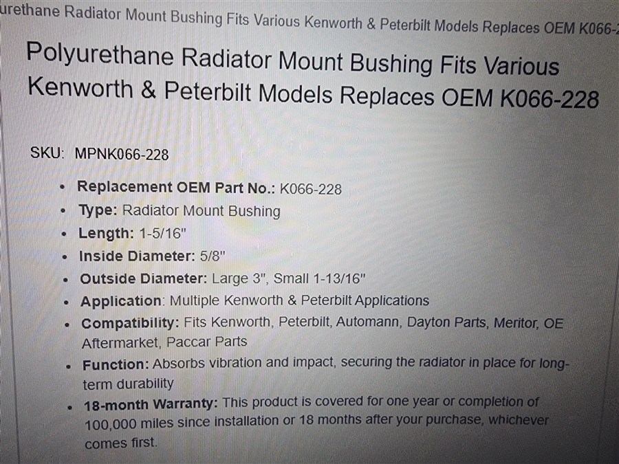 RADIATOR MOUNT BUSHING KENWORTH &PETERBILT MODEL OEM K066-228