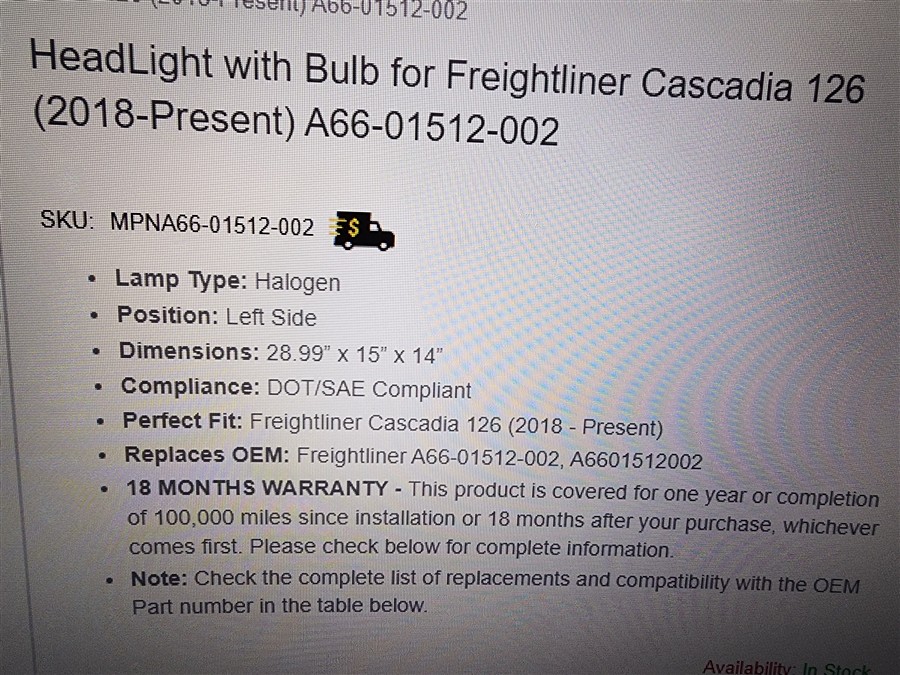 HEADLIGHT FREIGHTLINER CASCADIA 126 2018 -PRESENT A66-01512-003 RED RACK