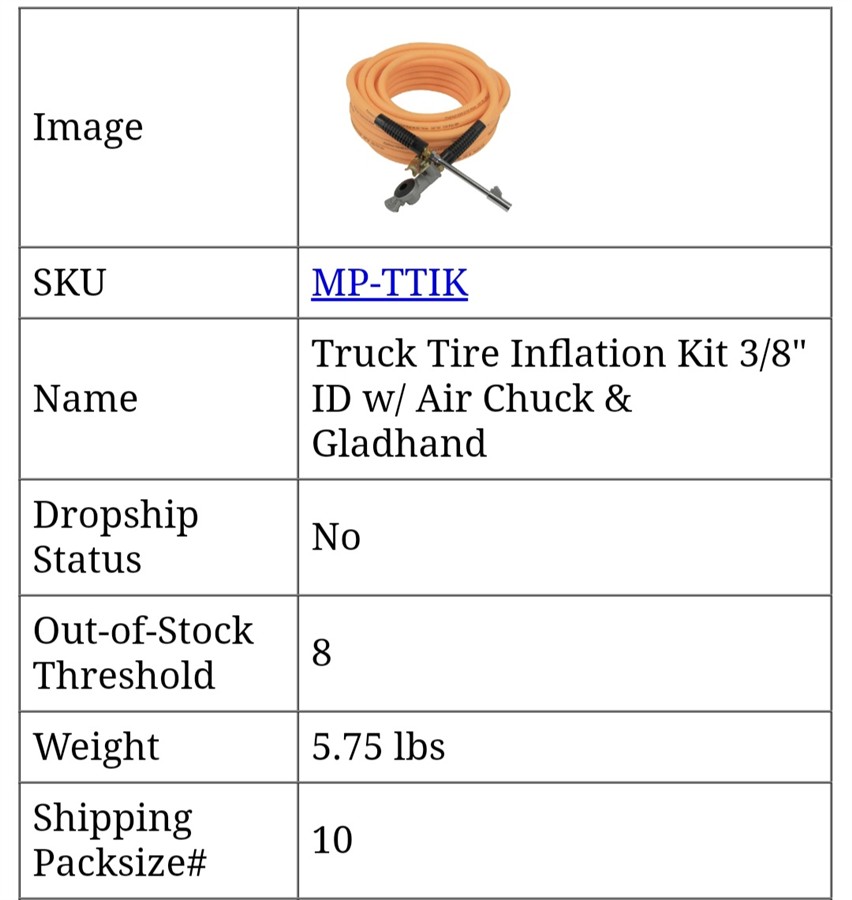 TRUCK TIRE INFLATION KIT 3/8"ID W AIR CHUCK GLANDHAND