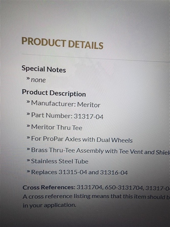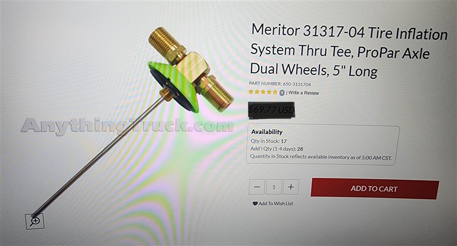 MERITOR 31317-04 TIRE INFLATION SYSTEM THRU TEE PROPAR AXLE DUAL WHEELS. 5" LONG on red rack